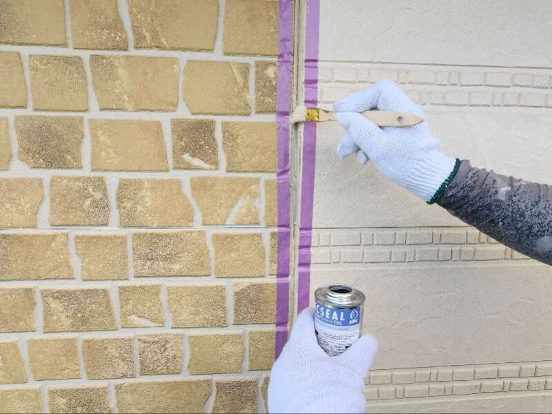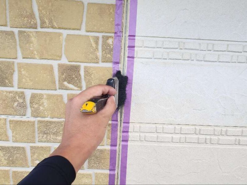 新しいシーリング材を埋め込む前に、古いシーリング材が埋め込まれていた部分を綺麗に掃除します。【外壁】プライマー塗布