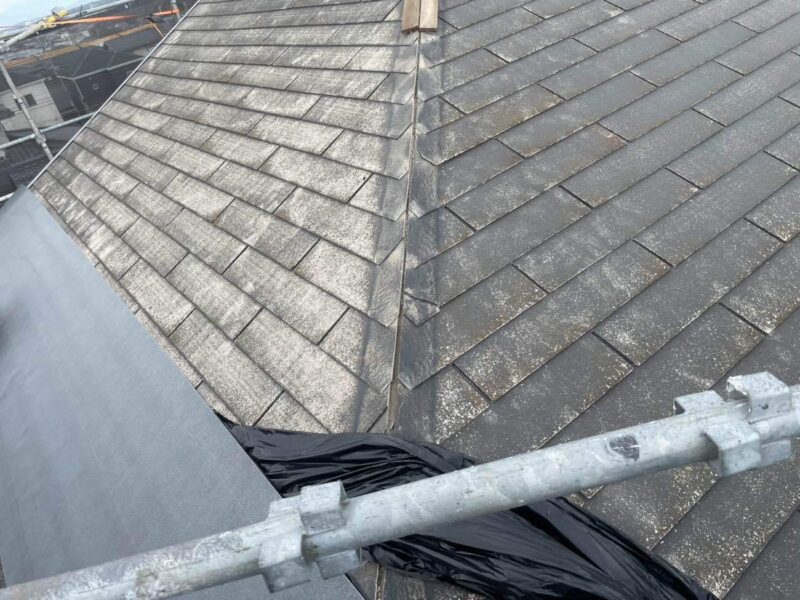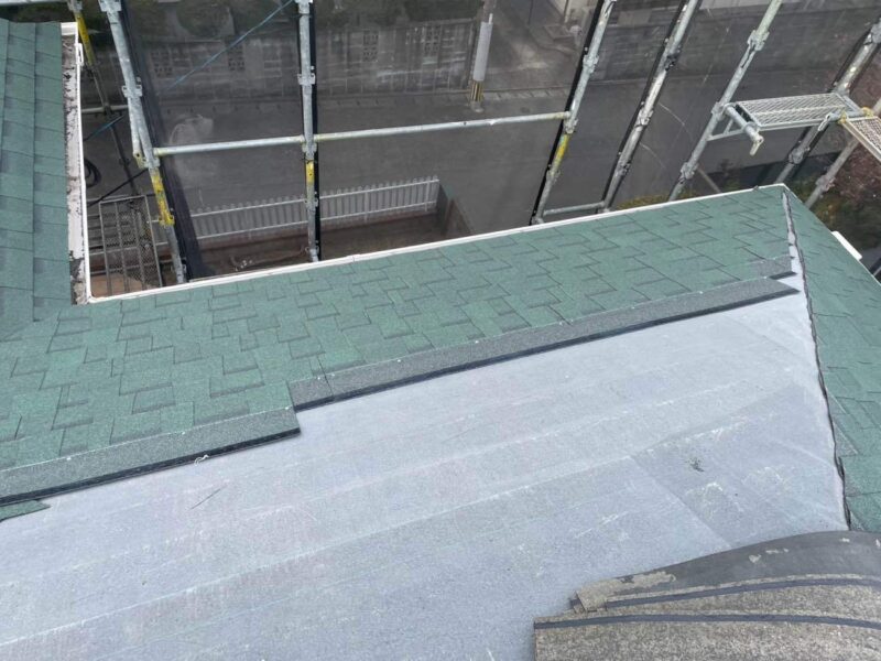 既存の棟板金を撤去後、ルーフィングを張っていきます。