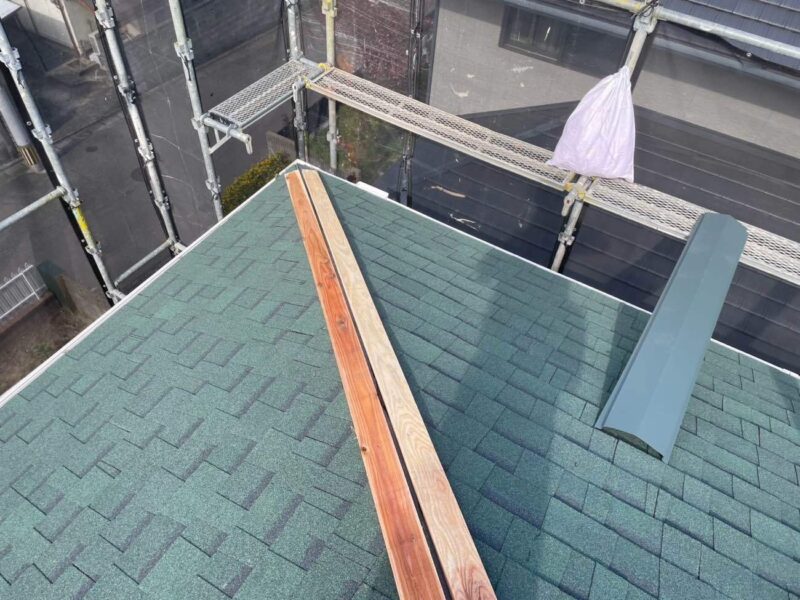 屋根材を張り終えたら棟下地を取付けます。